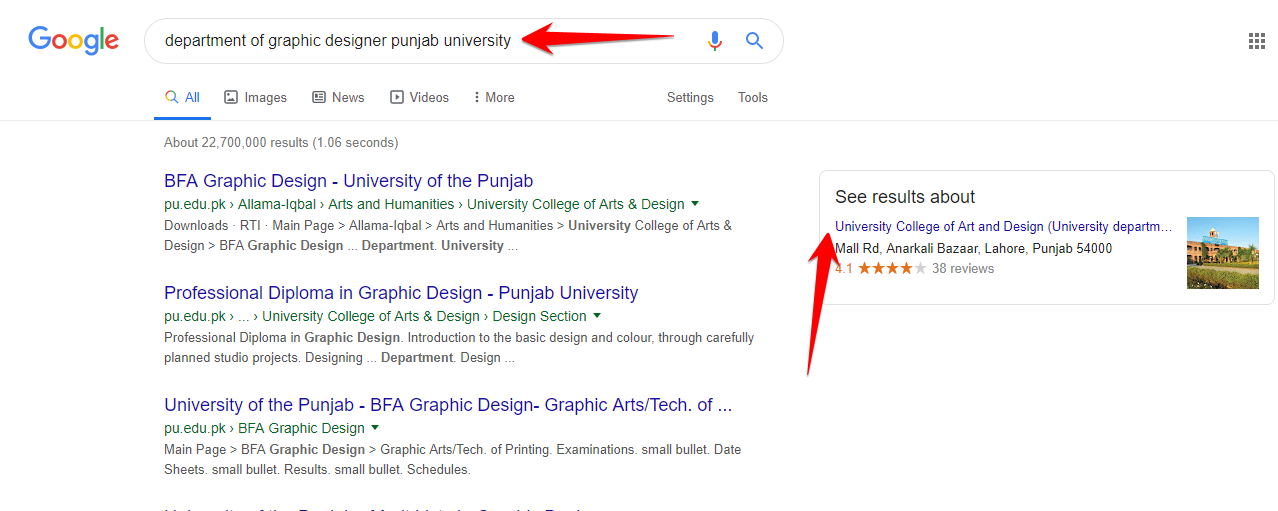 To find the department of Graphic Designing in any university, just type Graphic Designing  + university name like.