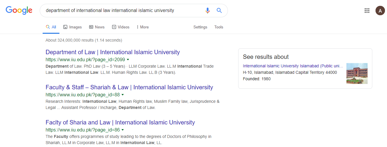 I am searching do people search International Law in Pakistan? If so, which province or city.