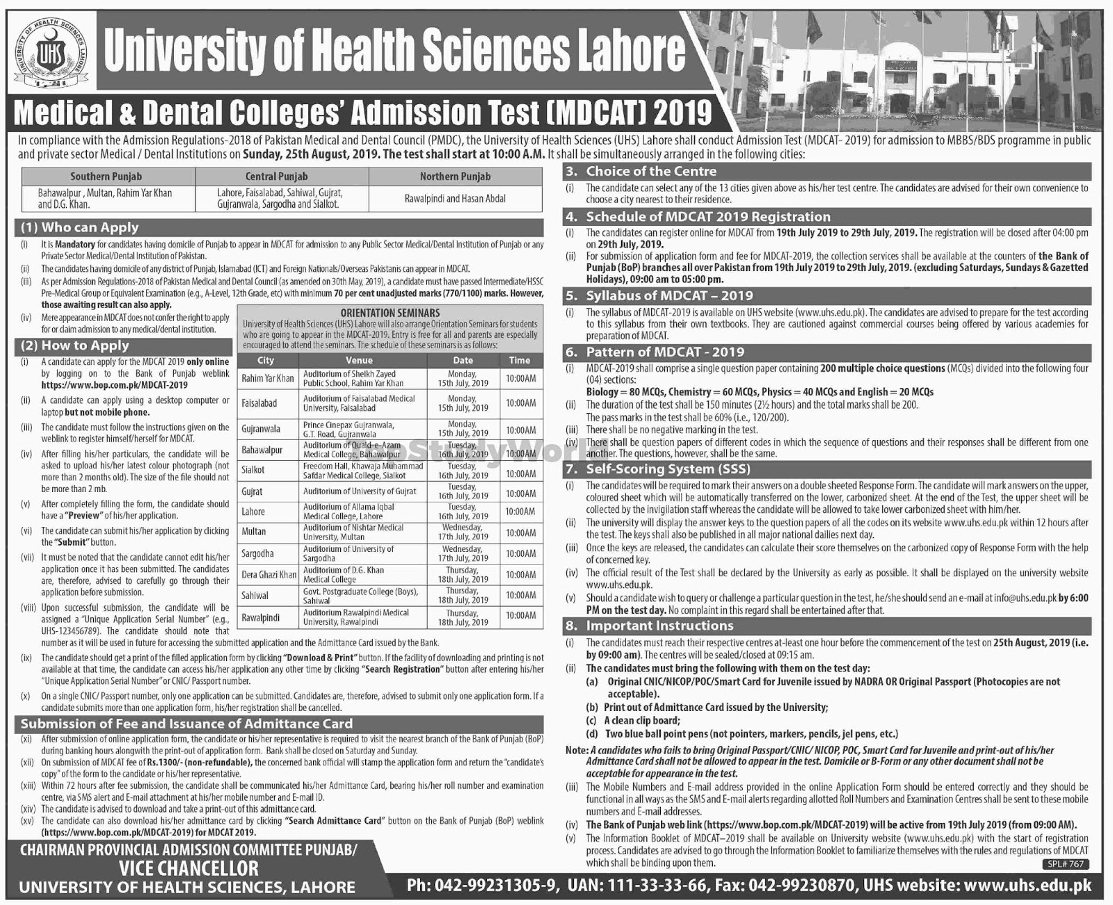 The syllabus of MDCAT-2019 is available on the UHS website (www.u hs.edu.pk). The candidates are advised to prepare for the test according to this syllabus from their own textbooks. They are cautioned against commercial courses being offered by various academies for preparation of MDCAT.