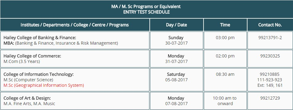 Every program has its own date when the Entry Test will be conducted. Entry Test is compulsory for all the program mentioned above, for all the seats even for the reserved seats, all compasses and for morning and evening programs,